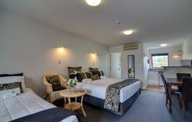 A super king-size bed plus 1 single bed in a studio apartment with an ensuite, kitchen facilities, TV, WiFi and outdoor seating.